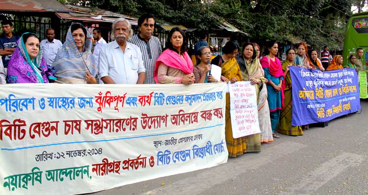 Coalition Against Bt. Brinjal, Bangladesdh (Bt Begun Birodhi Morcha) is an alliance of various environmental and social groups and individual scientists, intellectuals, journalists, lawyers and women and health activists. It has been protesting against the approval of Bt. Brinjal in Bangladesh which poses threat to human health, biodiversity, environment and mostl importantly farmers' rights. The Coalition calls upon the government to revoke the approval and take appropriate measure to ensure safety of human health, preserve diversity of local variety brinjals and ensure farmers rights.