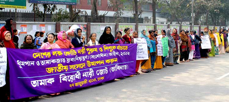 Tamak Birodhi Nari Jote (TABINAJ) is the first anti-tobacco alliance of women in Bangladesh which has taken up anti-tobacco campaign to save women, men and children from the hazards of tobacco. It is against smoking and use of smokeless tobacco products which are mostly consumed by women. The Alliance is against tobacco cultivation and use of women and child labour in the hazrduous biri industry. Tabinaj is actively lobbying for Law Amendment of the Tobacco Control Law for its effective implementation. Tabinaj member organisation are working in over 43 districts of Bangladesh