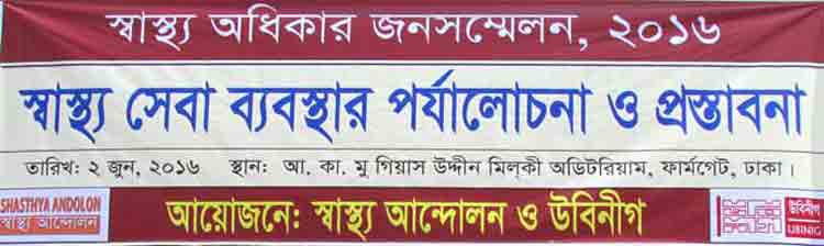 ঢাকা ২০ জুলাই, ২০১০: স্বাস্থ্য ও পরিবার কল্যাণ মন্ত্রণালয় এক সিদ্ধান্তের মাধ্যমে সরকার পরিচালিত রাষ্ট্রায়াত্ব জনগণের হাসপাতালগুলোতে ইউজার ফি বৃদ্ধি এবং এ সকল অর্থ চিকিৎসক, নার্স, টেকনিশিয়ান এবং হাসপাতালের অন্যান্য কর্মকর্তা কর্মচারীদের মাঝে বিতরণের উদ্যোগ গ্রহণ করা হয়েছে। অর্থনৈতিক মন্দা ও দারিদ্রতা ক্রমাগত বৃদ্ধি এবং জনগণের স্বাস্থ্য সেবা প্রদানের লক্ষ্যে কমিউনিটি ক্লিনিকের মতো সরকারের অব্যাহত উদ্যোগের প্রেক্ষিতে জনগণের অর্থে পরিচালিত রাষ্ট্রীয় হাসপাতালগুলোতে ইউজার ফি বৃদ্ধি অযৌতিক এবং অসাংবিধানিক। দেশের স্বাস্থ্য অধিকার রক্ষায় কর্যরত প্রতিটি ব্যক্তি, সংগঠন আামরা অনতিবিলম্বে এ কার্যক্রম বন্ধে সরকারকে আহবান জানাই। জনগণের হাসপাতালে ইউজার ফি গ্রহণের প্রেক্ষিতে স্বাস্থ্য অধিকার লংঙ্ঘনসহ নানা সমস্যা সৃষ্টি হবে।