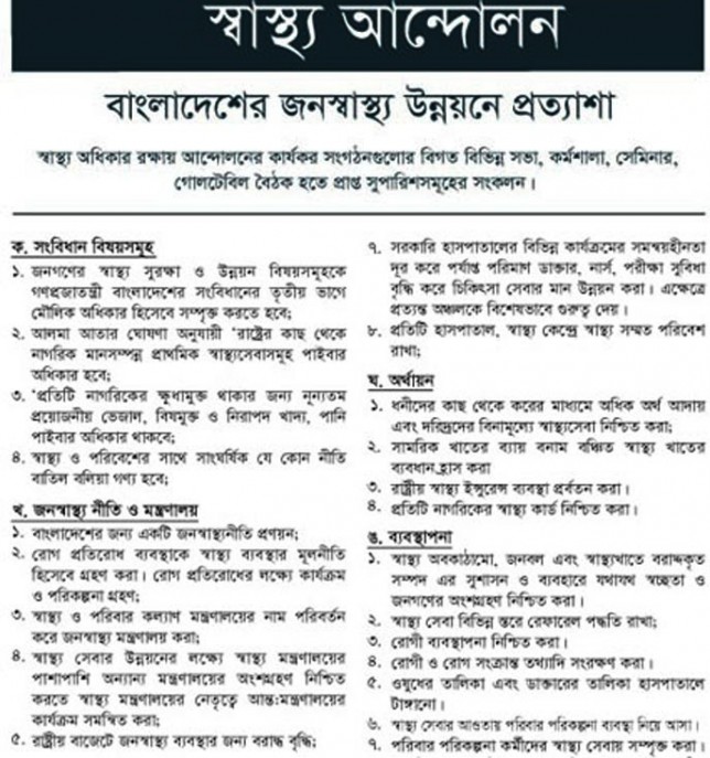 স্বাস্থ্য আন্দোলন বাংলাদেশের জনস্বাস্থ্য উন্নয়নে প্রত্যাশা স্বাস্থ্য অধিকার রক্ষায় আন্দোলনের কার্যকর সংগঠনগুলোর বিগত বিভিন্ন সভা, কর্মশালা, সেমিনার,গোলটেবিল বৈঠক হতে প্রাপ্ত সুপারিশসমূহের সংকলন।