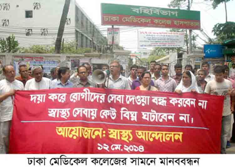 গত ১২ মে, ২০১৪ সকাল ১১ টায় স্বাস্থ্য আন্দোলন নেটওয়ার্ক ঢাকা মেডিকেল কলেজের বর্হিবিভাগের গেটের সামনে (দয়া করে রোগীদের সেবা দেয়া বন্ধ করবেন না, স্বাস্থ্য সেবায় কেউ বিঘ্ন ঘটাবেন না) শীর্ষক মানব বন্ধন করে। মানববন্ধনে অংশগ্রহণ করেন বিভিন্ন সংগঠনের প্রতিনিধি, রোগী, রোগীর আত্মীয় ও সাধারন জনগণ।